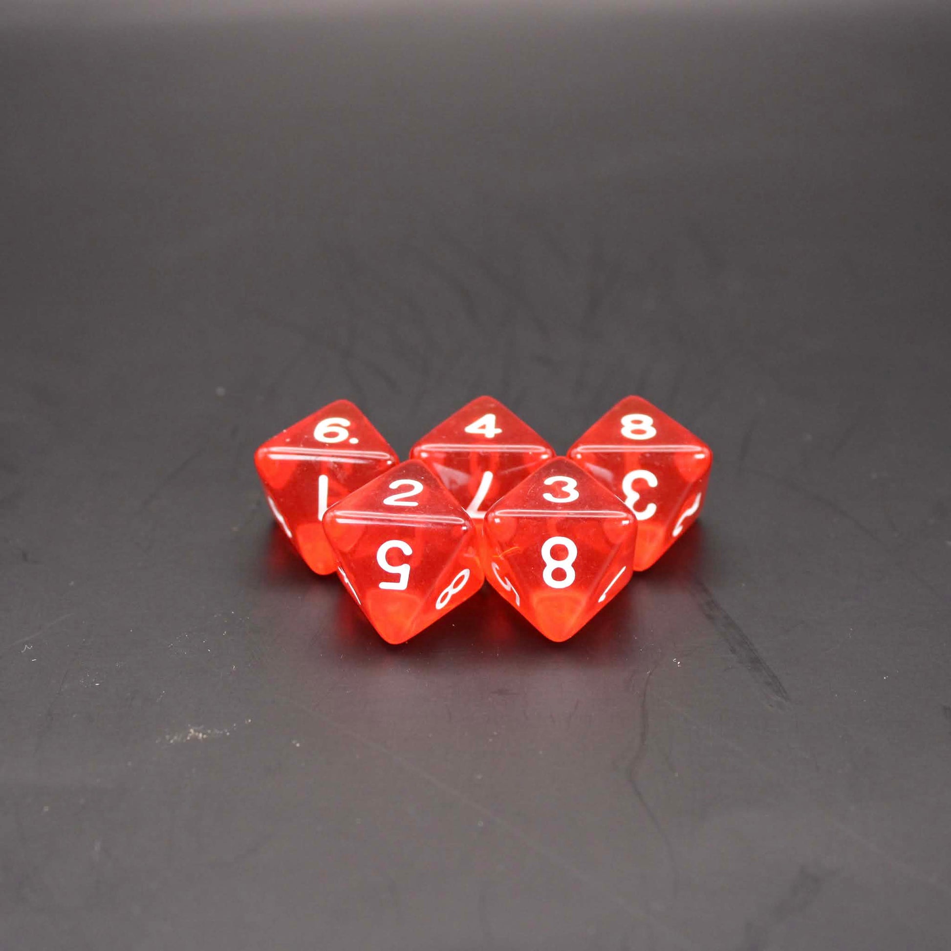 Five d8's in transparent ruby red.