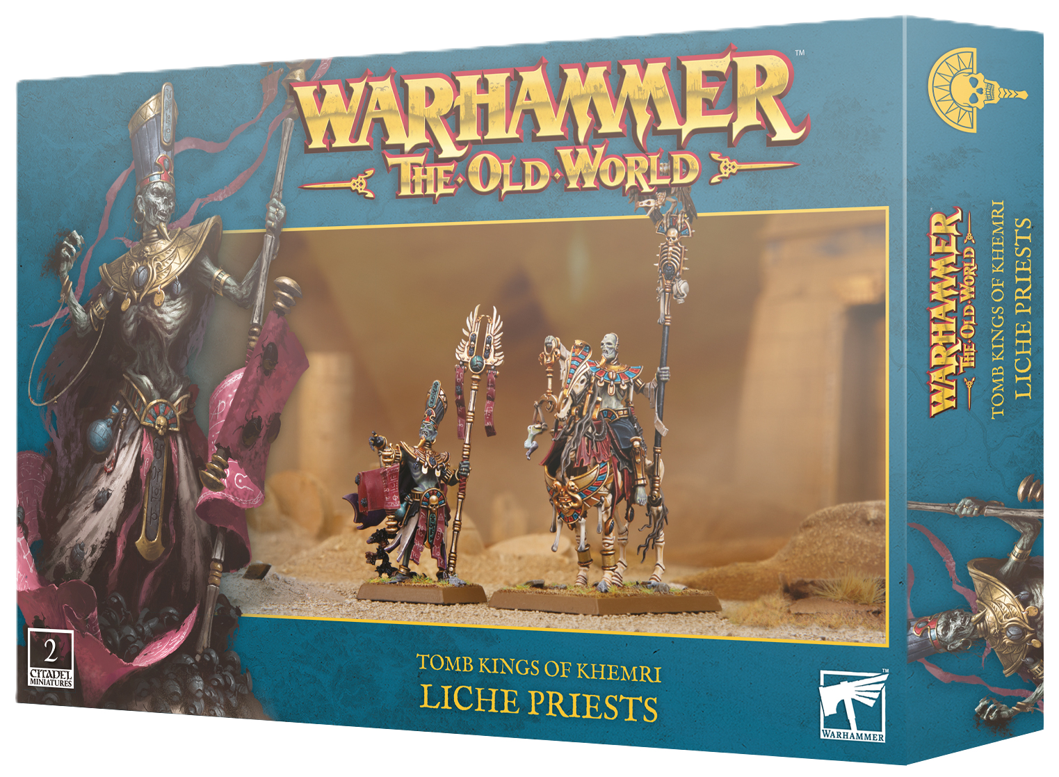 This multipart plastic kit builds two Liche Priests – one on foot and one mounted on a barded skeletal steed – powerful wizards for your Tomb Kings of Khemri armies in games of Warhammer: The Old World. Both miniatures can be used to represent a High Priest or a Mortuary Priest. As members of the Mortuary Cult, these powerful priests add magical mastery to your force, allowing you to unleash a variety of different spells to dominate the battlefield.